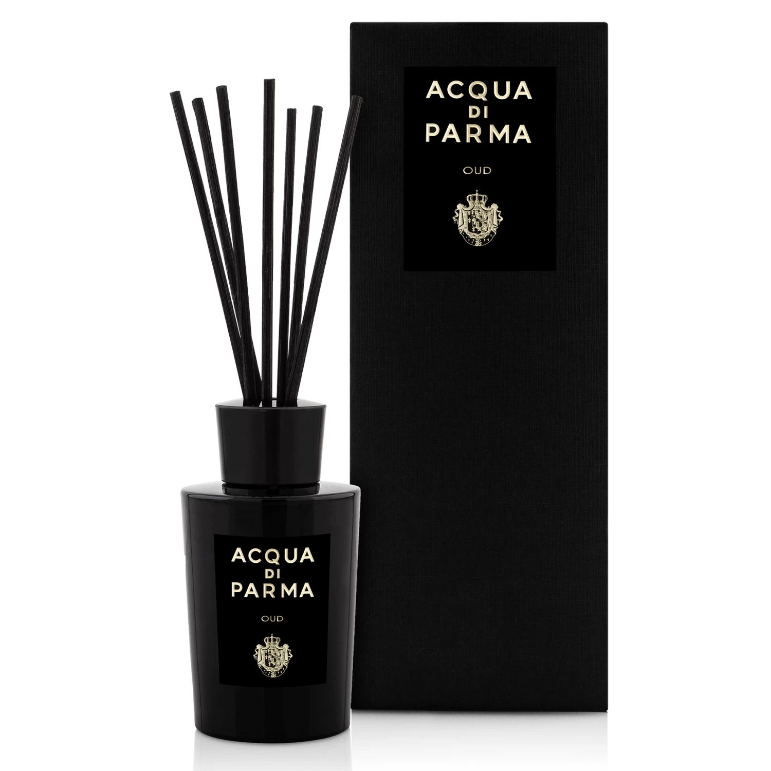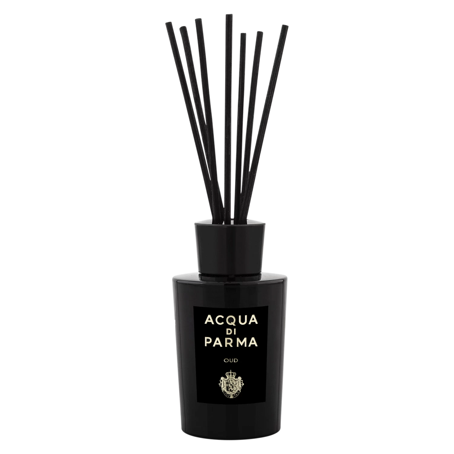 Der Oud-Diffusor ist eine subtile Harmonie der Kontraste und verkörpert die Parfumkunst von Signatures of The Sun, die das Prisma der Sonne zu einer reichhaltigen und geheimnisvollen Interpretation bringt. Der Diffusor besteht aus klassischem schwarzem Rattanrohr und befindet sich in einem glänzend schwarz lackierten Glasgefäß mit einem schwarzen Signatures-Etikett, das mit goldenen Buchstaben verziert ist. Der vielseitige und einfach zu verwendende Diffusor ist Teil der Home Collection und schafft eine Atmosphäre, in der die kostbare Essenz des Agarholzöls zu einer einzigartigen und raffinierten Komposition wird. Der 180 Gramm schwere Diffusor wird in einer faltbaren Umverpackung aus schwarzem FSC-Papier geliefert, die ein luxuriöses schwarzes, mattes Etikett mit einem in Heißgoldfolie geprägten Acqua di Parma-Logo enthält.