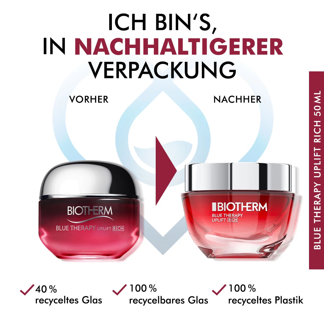 Die vitamin- und mineralstoffreichen Rotalgen sind in der Lage, selbst schwierigsten Umweltbedingungen zu trotzen und sich immer wieder zu regenerieren. Diese bemerkenswerte Eigenschaft wurde von den Laboratoires Biotherm für die Haut nutzbar gemacht und als Extrakt optimiert das Geheimnis von Blue Therapy Red Algae Uplift. In Kombination mit wertvollen Kollagen-