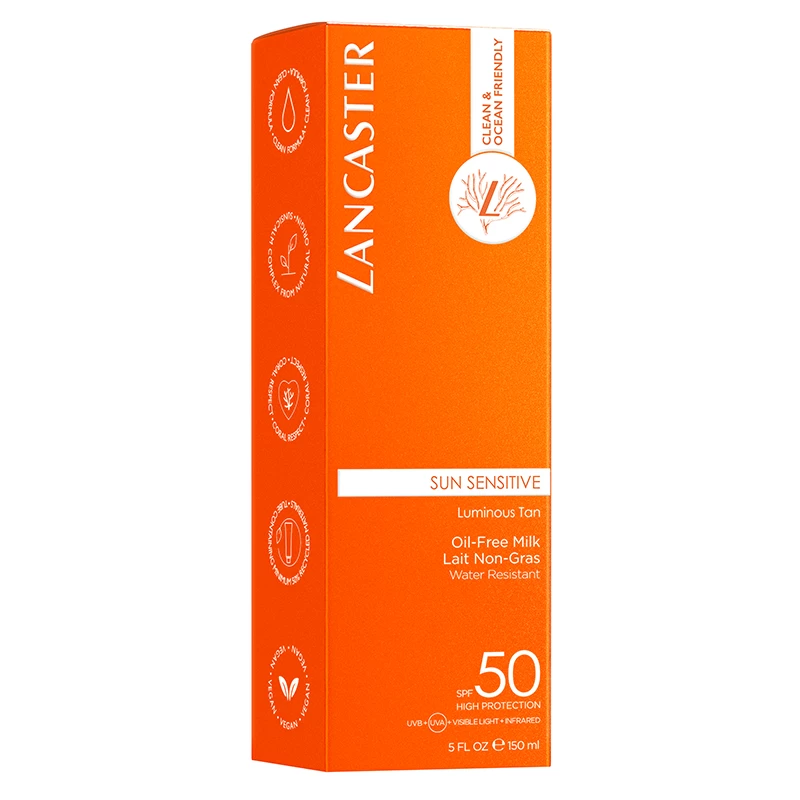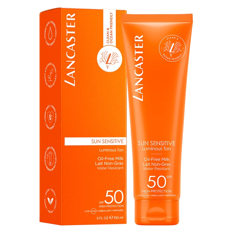 Sun Sensitive ist Lancasters leistungsstarker Sonnenschutz mit hochverträglicher Formel für empfindliche Haut. Die patentierte Full-Light-Technologie schützt vor UVA-, UVB-, sichtbarem Licht und Infrarotstrahlen, während der Sunsicalm Komplex natürlichen Ursprungs empfindliche Haut beruhigt und vor sonnenbedingten Schäden schützt. Die leichte und ölfreie milchige Textur, die sofort nach dem Auftragen einzieht, ist nicht nur clean und respektiert die Ozeane, sondern bietet auch ein höchst sinnliches Finish. Ihre Haut wird verschönert. Verwenden Sie die hochverträgliche, nicht klebrige Oil-Free Milk SPF 50 für ein angenehmes Gefühl auf Ihrer Haut.